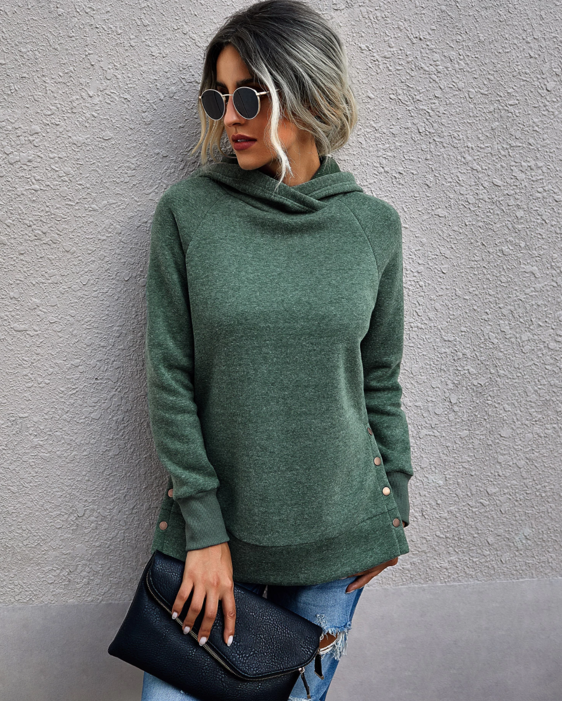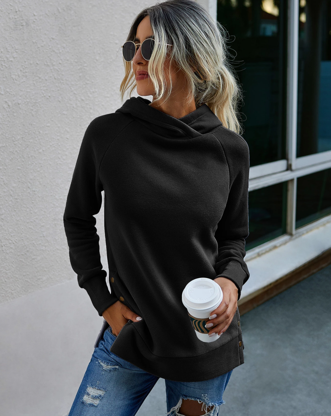 Cozy up in this slim fitting cotton sweatshirt and keep things simple and stylish with button detailing on the sides. The perfect length and fit for wearing over leggings and skinny jeans.